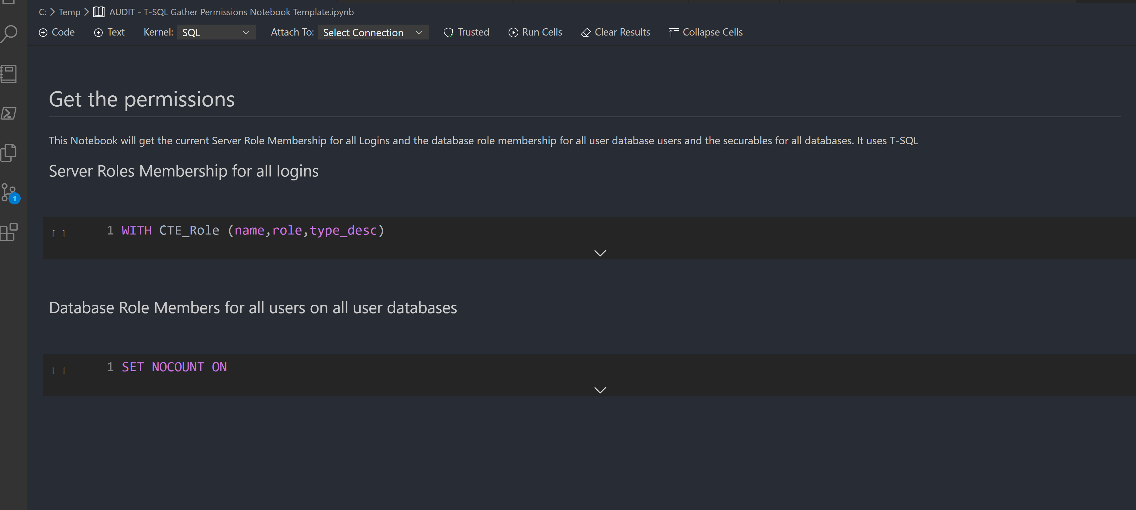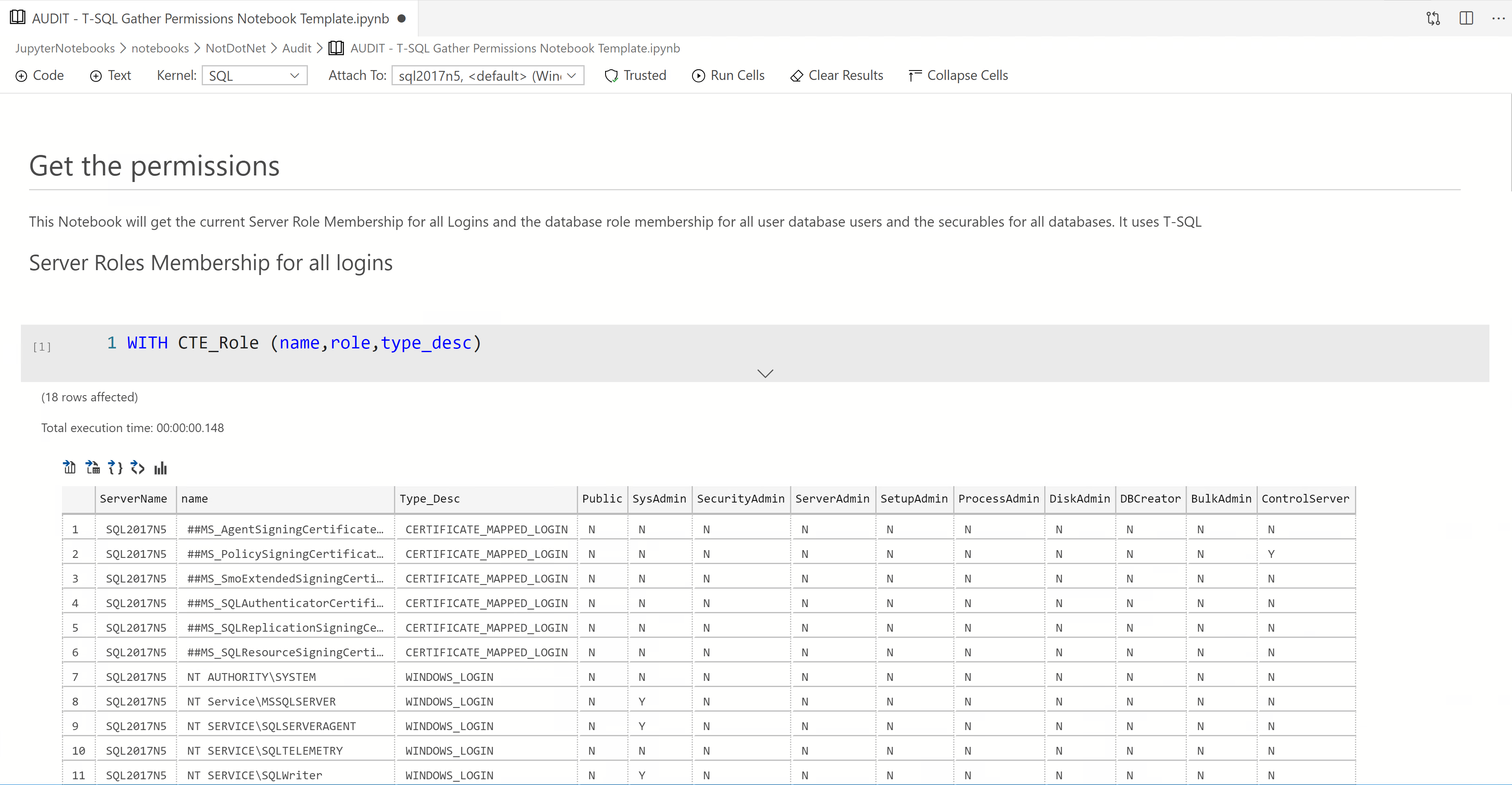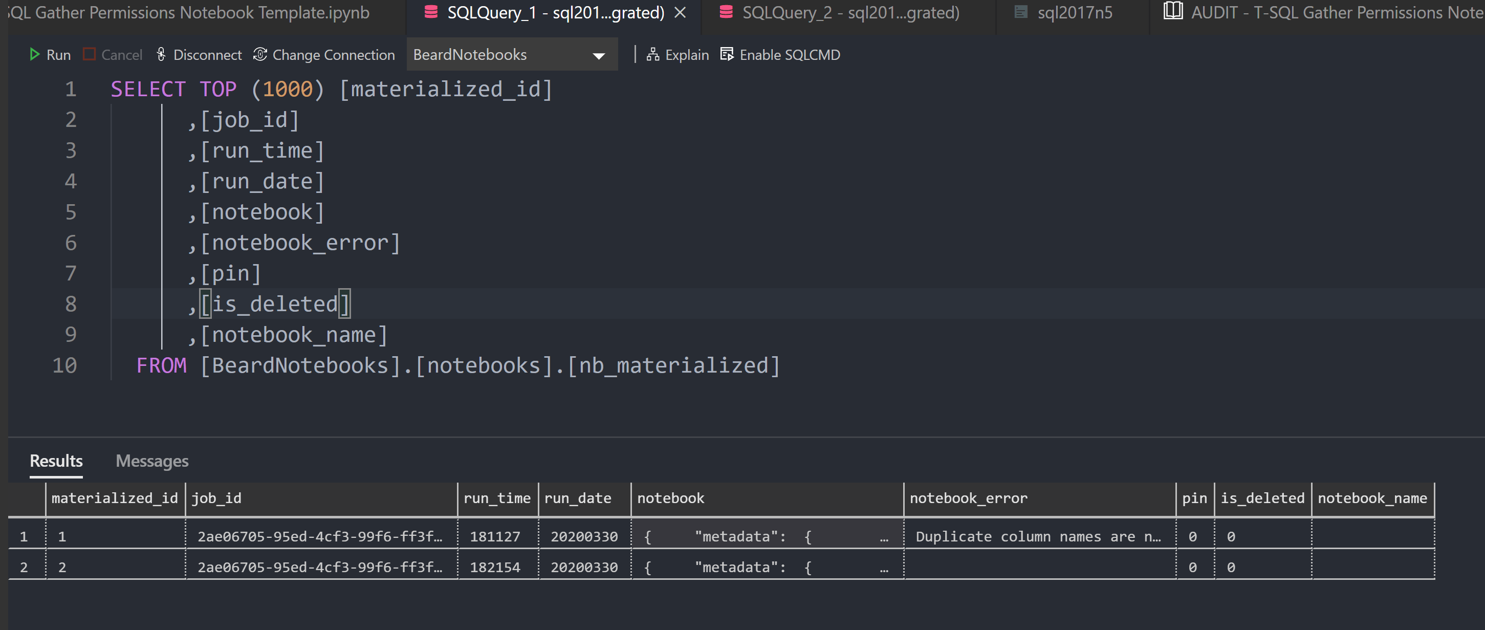 This works easily for T-SQL notebooks. I am going to use this one that I created that uses T-SQL to gather permissions using old code that was in a share somewhere. We can run the notebook and get the permissions and save the notebook and the results will be available for all time (unless you delete the notebook!)
