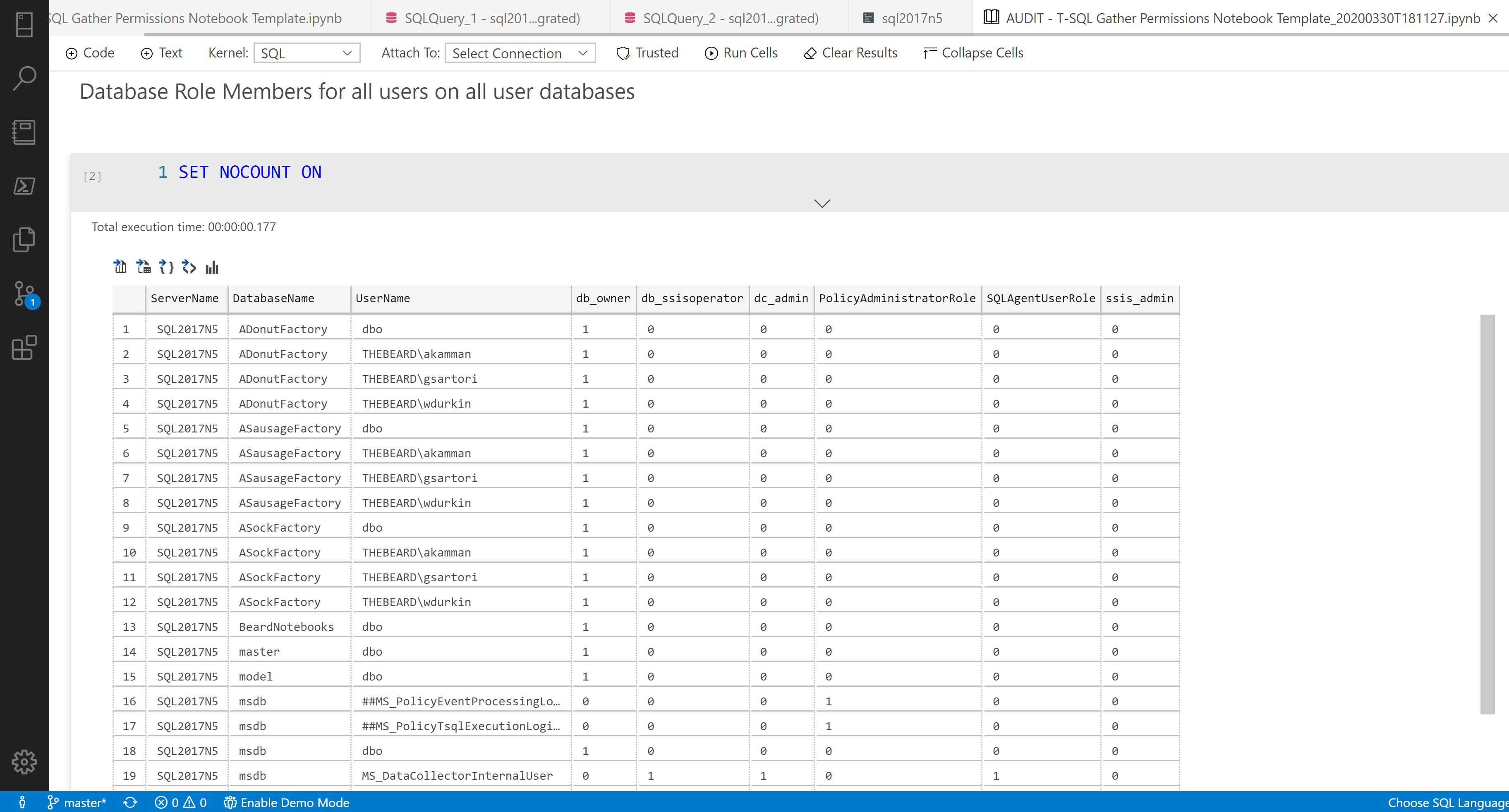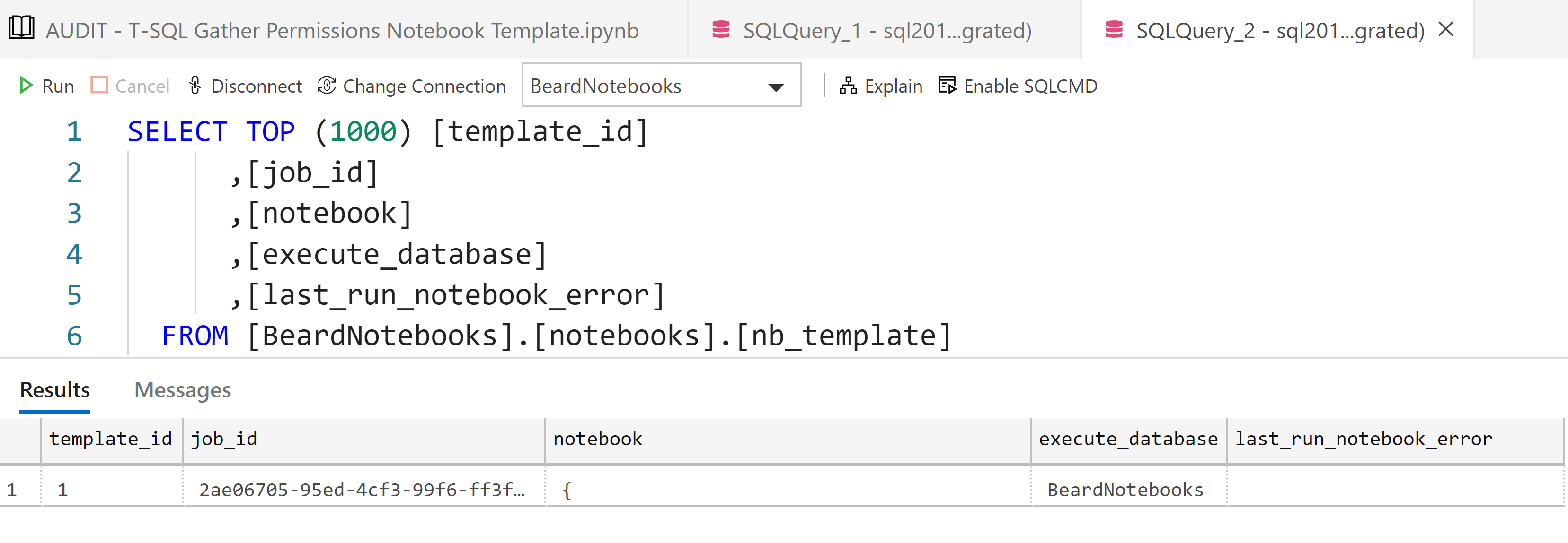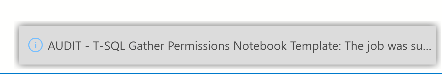 This works easily for T-SQL notebooks. I am going to use this one that I created that uses T-SQL to gather permissions using old code that was in a share somewhere. We can run the notebook and get the permissions and save the notebook and the results will be available for all time (unless you delete the notebook!)