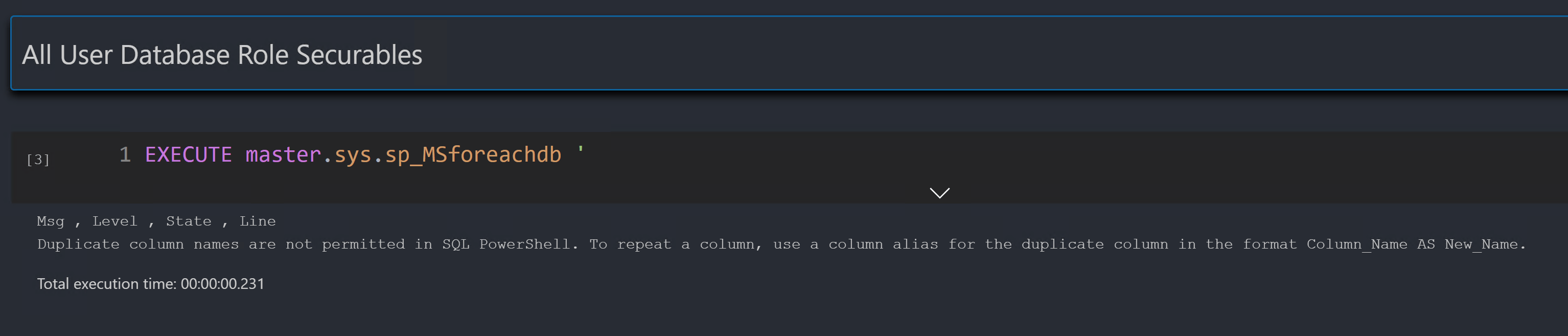 Msg , Level , State , Line Duplicate column names are not permitted in SQL PowerShell. To repeat a column, use a column alias for the duplicate column in the format Column_Name AS New_Name.