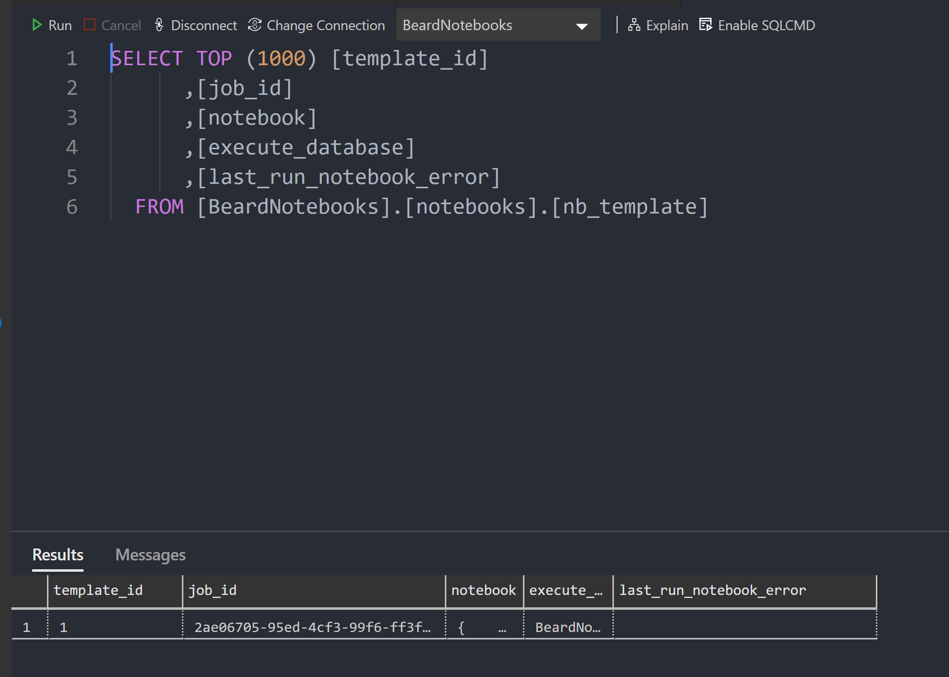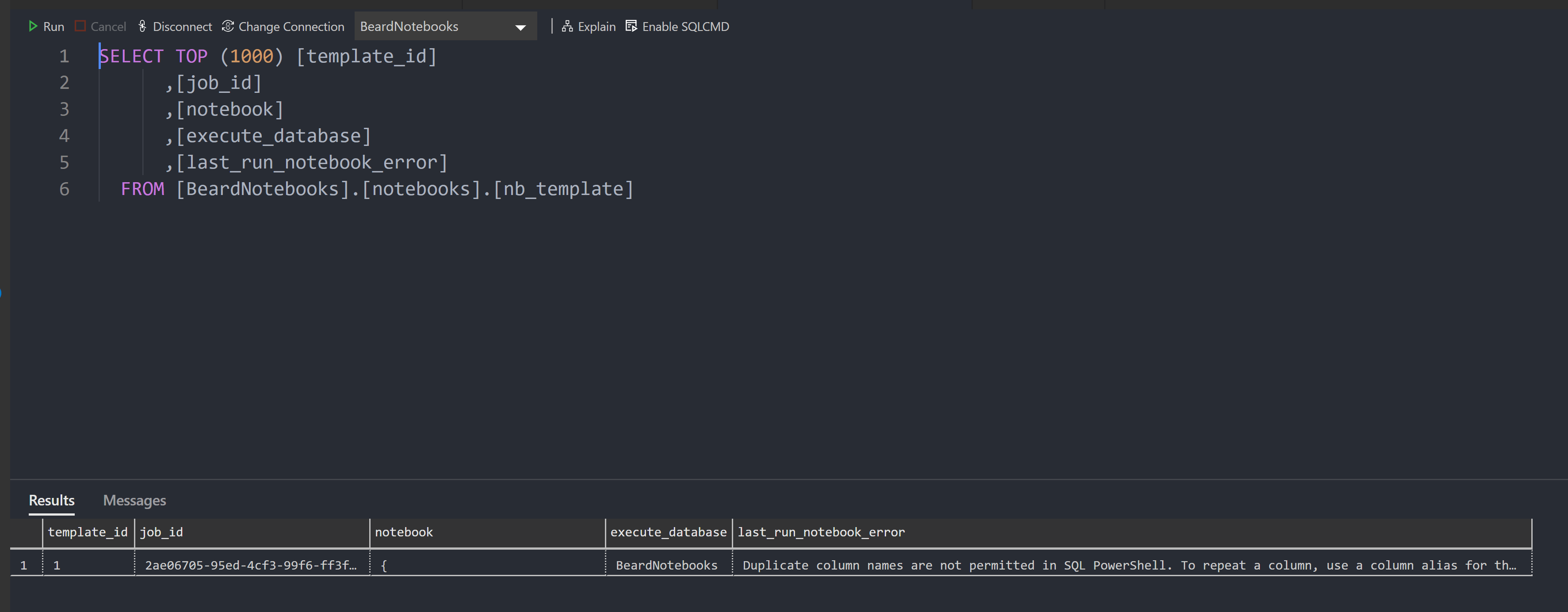 We have got an error from running the code via SQL PowerShell which is how the job is run. This error is also inserted into the notebooks.nb_template table